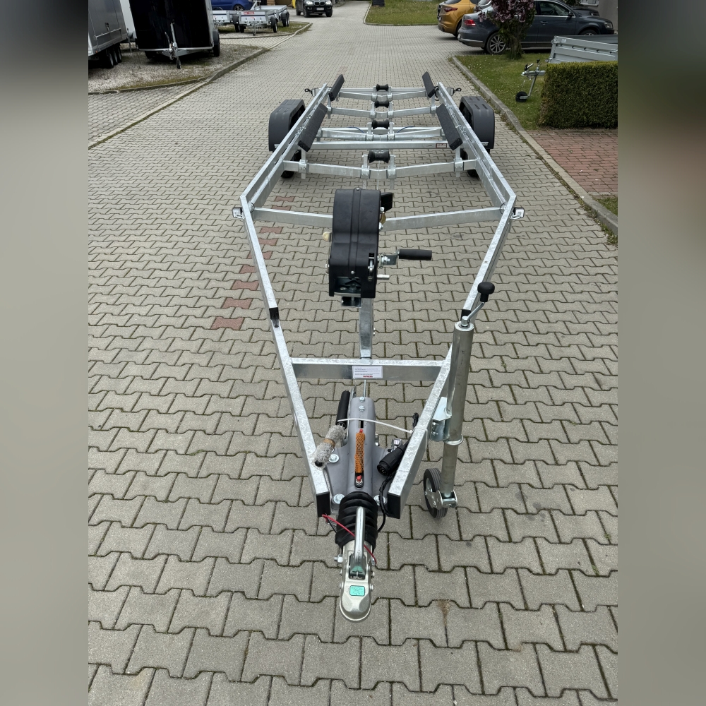 Dvounápravový břzděný přívěsný vozík určený pro převoz lodí o maximální délce 7500 mm. Ocelový rám vozíku je žárově pozinkován, což prodlužuje jeho životnost i při náročných podmínkách. V základní výbavě je kvalitní KNOTT naviják s navíjecím pásem , středové kýlové rolny 4ks, podpůrné ližiny 4ks, gumový V doraz na špic lodě, opěrné kolečko . Zadní světelnou rampa lze důmyslně odejmout , bez použití speciálního nářadí, díky čemuž je možné s přívěsem zacouvat přímo do vody a spustit loď / člun za pomoci navijáku. Délku přívěsu si umíte přizpůsobit podle potřeby. Stejně tak je polohovatelná i náprava přívěsu, abyste uměli lépe rozložit těžiště.