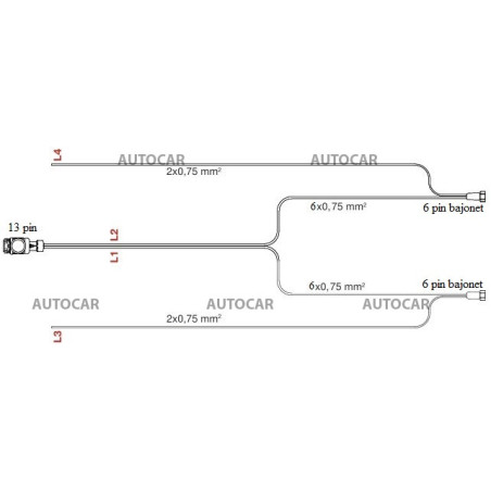 Kabeláž pro přívěsný vozík s 13pinovou zástrčkou a pozičními světly. Kabeláž má 6pinový bajonet pro rychlé a spolehlivé připojení světel. (na obrázku)