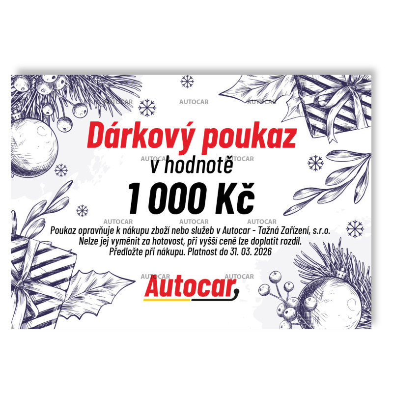 Dárkový poukaz Autocar v hodnotě 1 000 Kč – ideální dárek pro každého motoristu. Platnost do 31. 03. 2026.