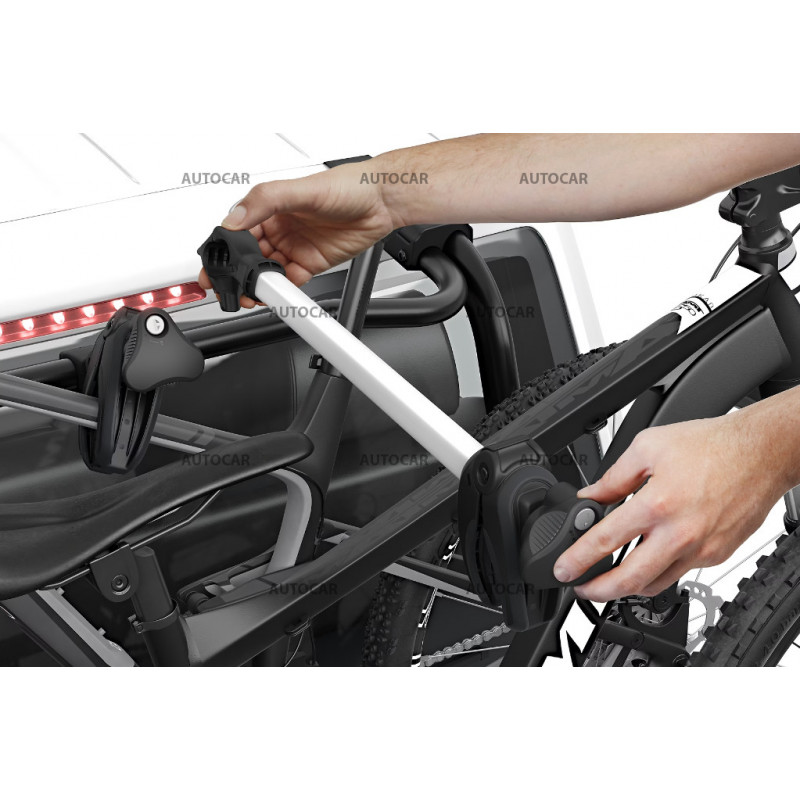 • Snadné upevnění kol díky odnímatelným držákům rámu vybaveným uzamykatelnými růžicemi s omezovačem momentu utažení Thule AcuTight, který cvakne, jakmile je kolo optimálně upevněno