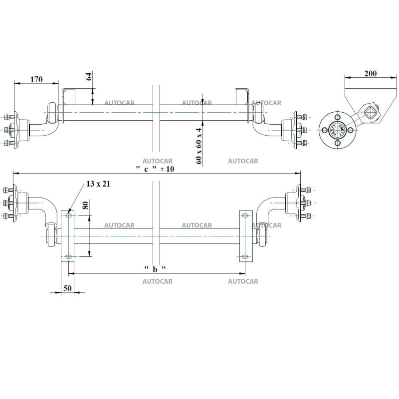 KNOTT náprava , typ VG7-L, nebrzděná, nosnost do 750 kg, rozteč montážních otvorů 1000 mm, šířka nápravy přes náboje 1430 mm, šroubení náboje 100x4
