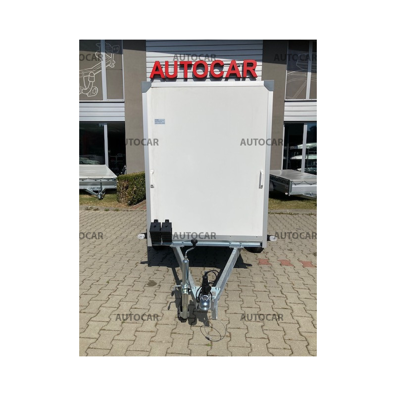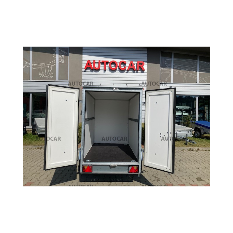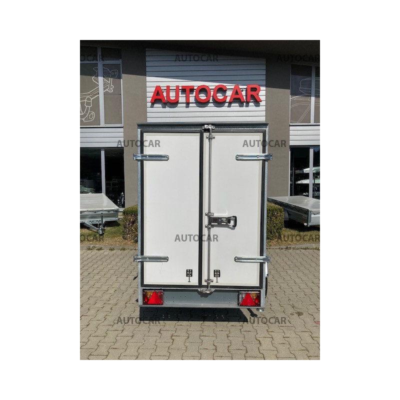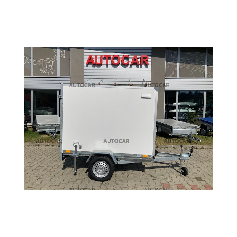 Skriňový Přívěsný vozík. Steny přívěsného vozíka Jsou vyrobené z proglejky, podlaha je z vedovzdorní proglejky. V štandardnom vyhotovení je Skříň v bíléj barvě.