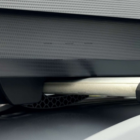 Oboustranné otevírání s 6-bodovým zámkem, TEF upínací systém s pryžovými vložkami, přední difuzor pro tichou jízdu a pevné dno 5 mm ABS s nosnost 75 kg. Povrchová hexagonová struktura zvýrazňuje sportovně-aerodynamické linie.