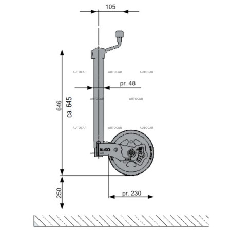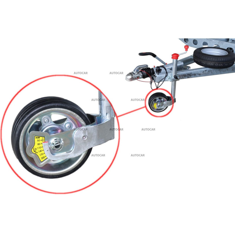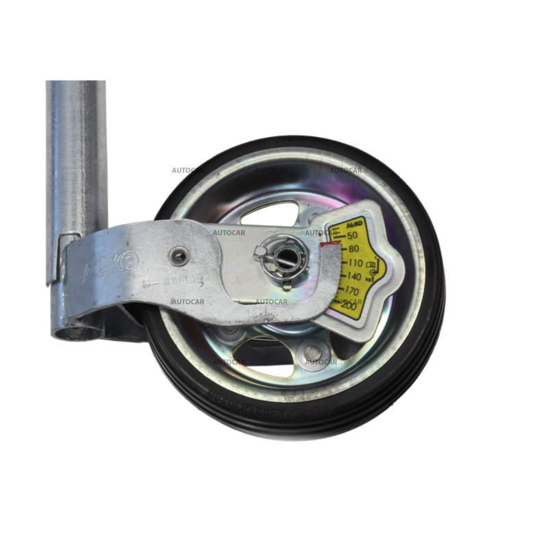 Opěrné kolečko AL-KO s nosnost do 300 kg, určené pro snadnou manipulaci s přívěsem a kontrolu zatížení.