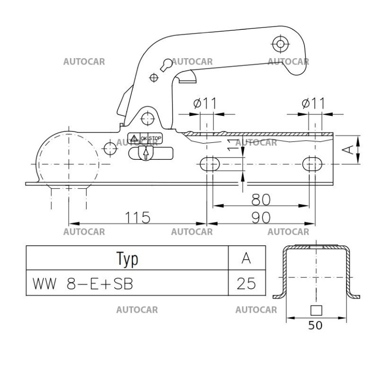 Standardní přívěsný kloub do 800 kg pro nebrzděné přívěsy. Určen pro montáž na čtyřhran o šířce 50 mm. Ovládací rukojeť je vybavena stlačovací pojistkou a otvorem pro zámek. Vertikální i horizontální otvory mají rozteč 90 mm. Spojka je po celou dobu své životnosti samonastavitelná a není třeba ji nastavovat. Míra opotřebování tažné spojky, resp. kulového čepu, je zobrazena na přehledném bočním ukazateli.