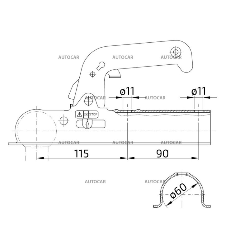 Standardní tažná spojka 800 kg pro nebrzděné přívěsy. Určena pro montáž na trubku o průměru 60 mm.