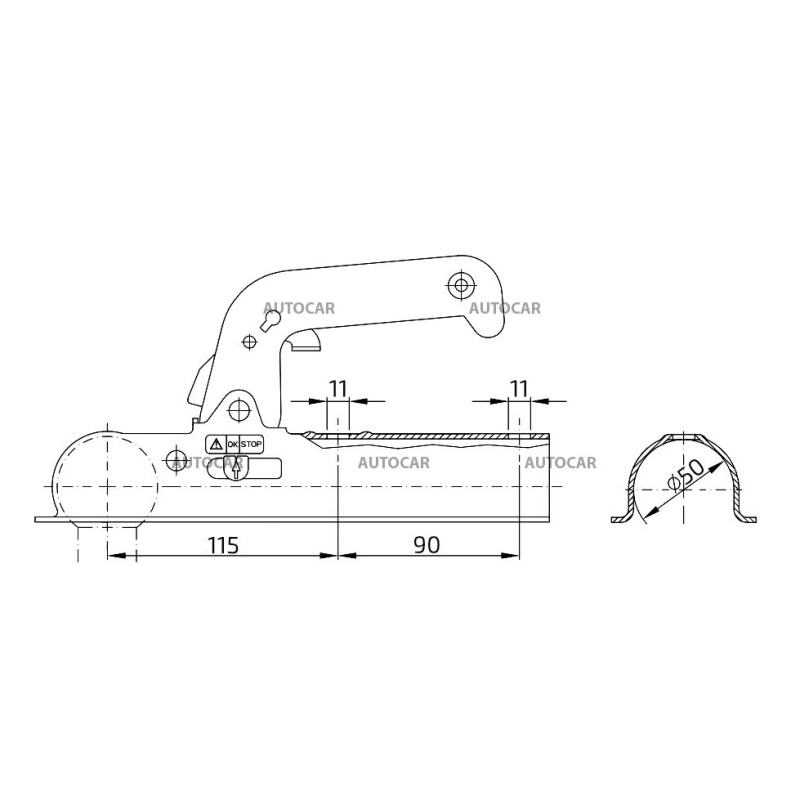 Přívěsný kloub do 800 kg maximální hmotnosti pro nebrzděné přívěsy. Určena pro montáž na trubku o průměru 50 mm. Ovládací rukojeť je vybavena stlačovací pojistkou a otvorem pro zámek WW DBS 8/AK7. Spojka je po celou dobu své životnosti samonastavitelná. Míra opotřebení přívěsného kloubu, resp. kulového čepu, je zobrazena na přehledném bočním ukazateli.