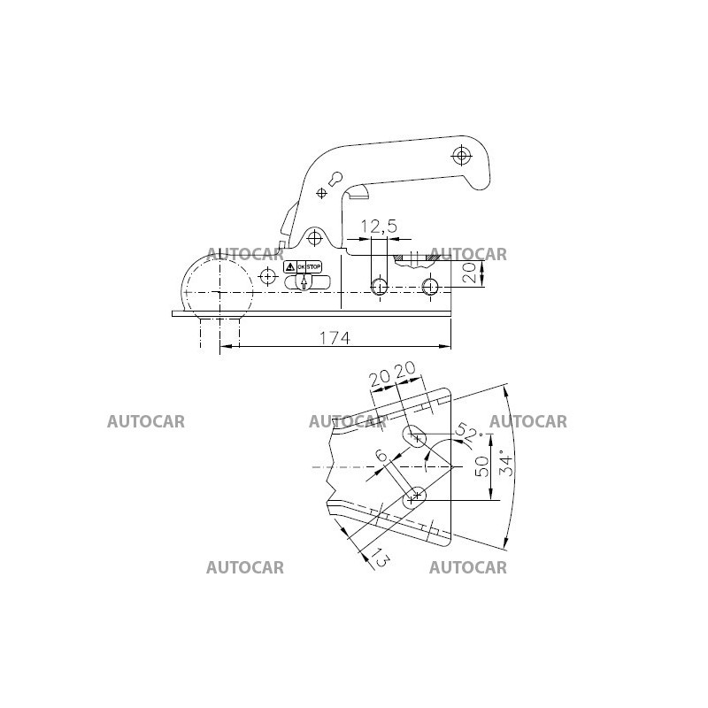 Přívěsný kloub na nebrzděné přívěsy do 750kg. Určen k montáži na "V" oje a roztečí bočních děr 40mm a roztečí horních montážních otvorů 50mm. Ovládací madlo je vybaveno stlačovací pojistkou a otvorem pro zámek. Spojka je po celou dobu své životnosti samočinná a není třeba ji nastavovat. Míra opotřebování tažné spojky nebo kulového čepu je zobrazována na přehledném bočním ukazateli.